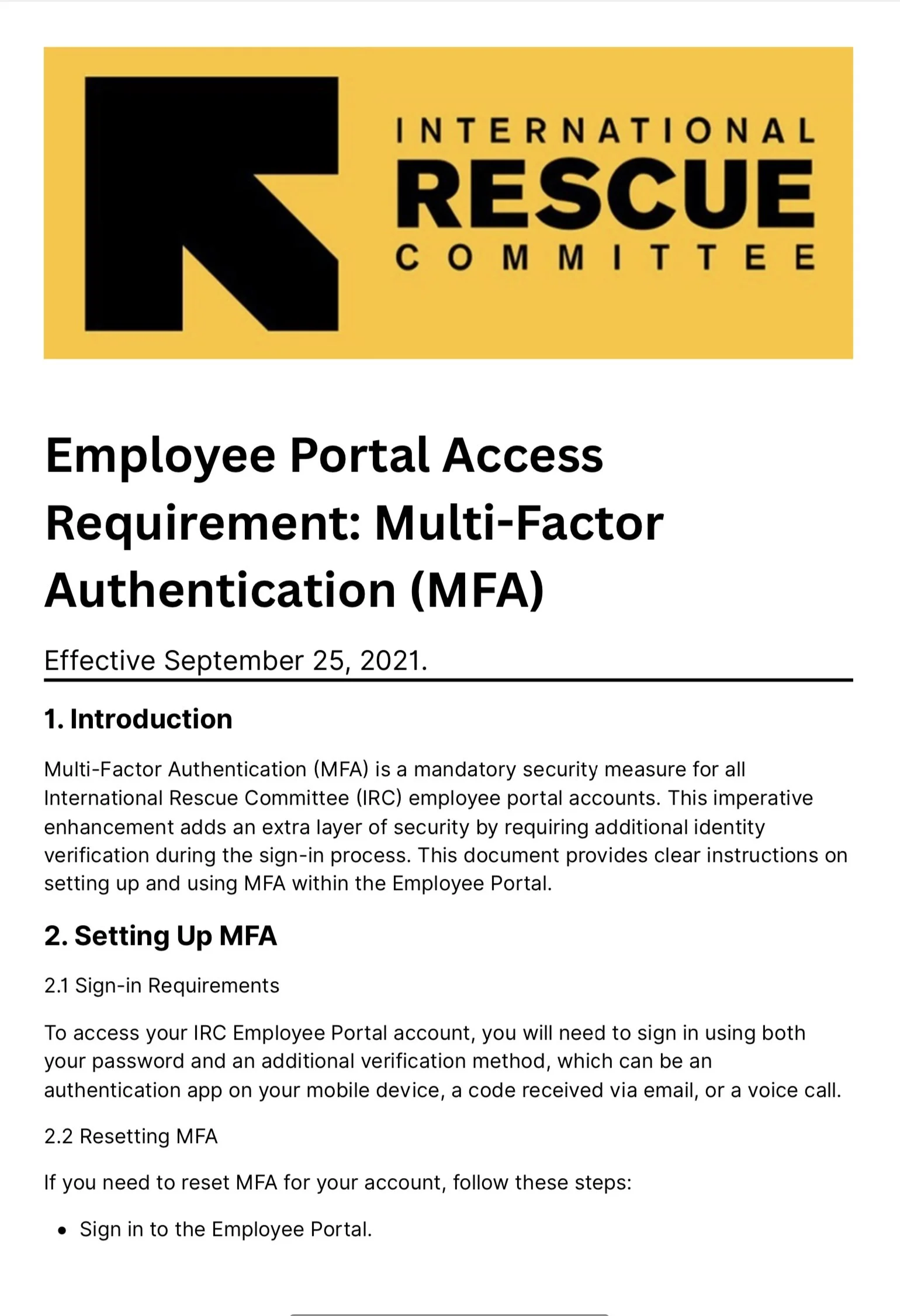 In this technical documentation, I employed strong technical writing skills; emphasizing a structured approach, user-centric language, and step-by-step guidance. The document, organized into clear sections, provides comprehensive instructions for setting up and using MFA, catering to both technical and non-technical users. The inclusive design considers various verification methods, offering troubleshooting guidance for seamless user adoption. Emphasizing security measures, the documentation underscores best practices and positions MFA as a proactive security enhancement. Additionally, the acknowledgment of managerial involvement reflects a holistic approach to user and administrative needs. This piece serves as a testament to my ability to convey complex technical concepts clearly, ensuring a positive user experience and contributing to the overall security posture of the organization.
